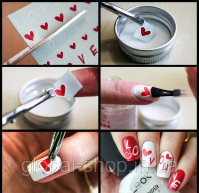 7. Прибираємо плівку зі слайдера, відрізаємо потрібний шматочок. Пропускаємо у воду. Беремо пінцет малюнок і розміщуємо на нігтьовій пластині. Сушимо в лампі.
